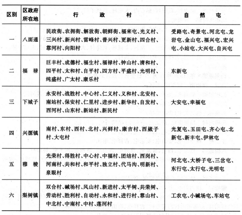 1947年1月5日,南穆棱县(穆棱县)辖南区、北区、兴源区、磨刀石区、下城子区、马桥河区。北穆棱县(穆北县)辖八面通区、东区、西区、梨树镇区、穆棱矿。